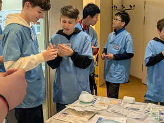 Wundexpertin Franziska Mischke-Weber zeigt den Schülern verschiedene Verbandsmaterialien und deren Einsatzmöglichkeiten, die direkt ausprobiert und angewendet werden durften.