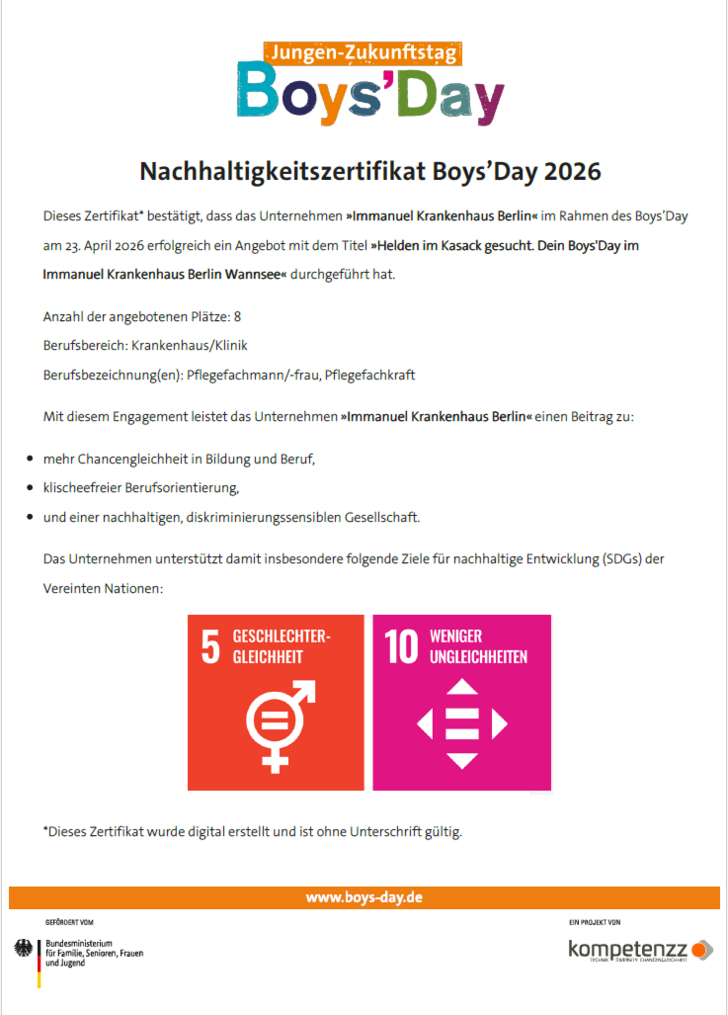 Der Boys’ Day im Immanuel Krankenhaus Berlin bot damit nicht nur informative Einblicke, sondern auch eine wertvolle Orientierung für alle, die sich für eine berufliche Zukunft im Gesundheitswesen interessieren.